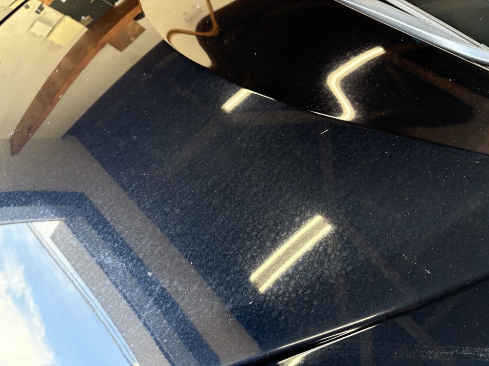 黒ですので、水分+日差しですぐにこうなってしまいます。洗車後とありますが、雨染みを落としやすくする洗剤を使用しても落ちませんので、通常の洗剤を使用した洗車では太刀打ちできないのはご想像頂けると思います。