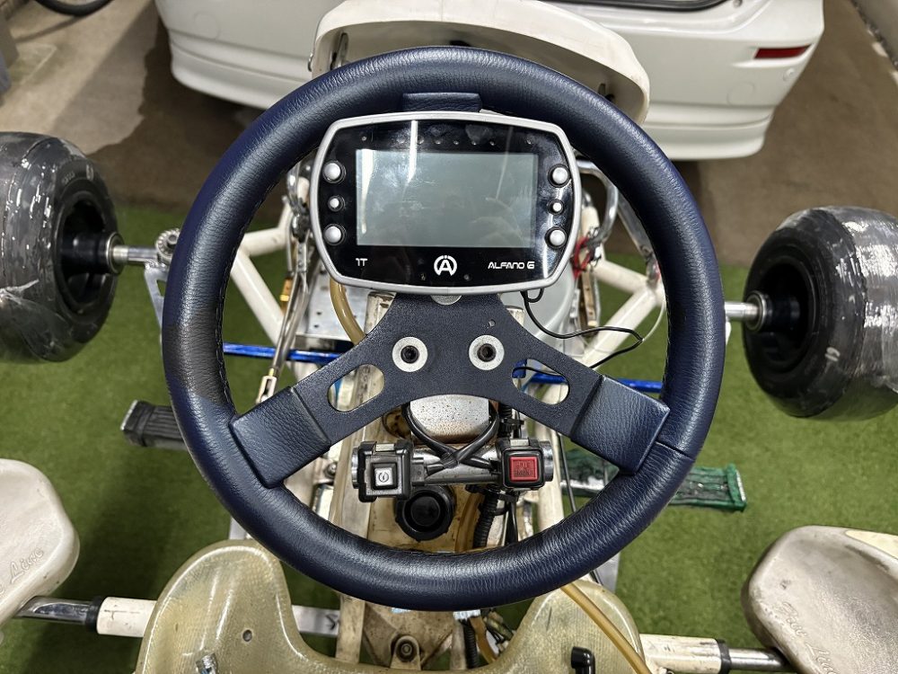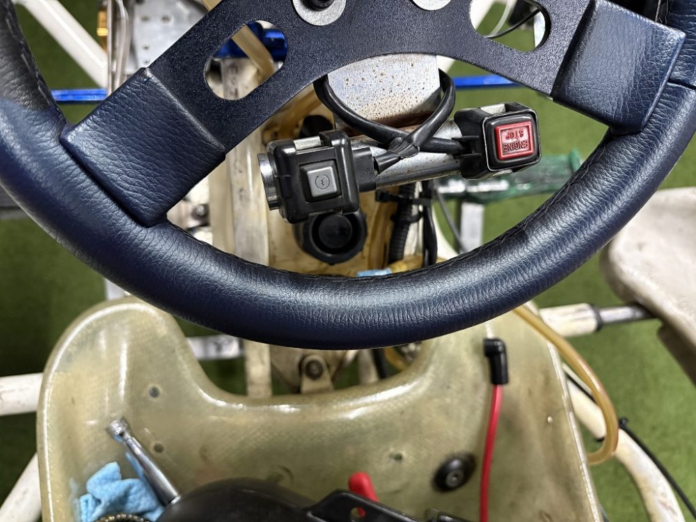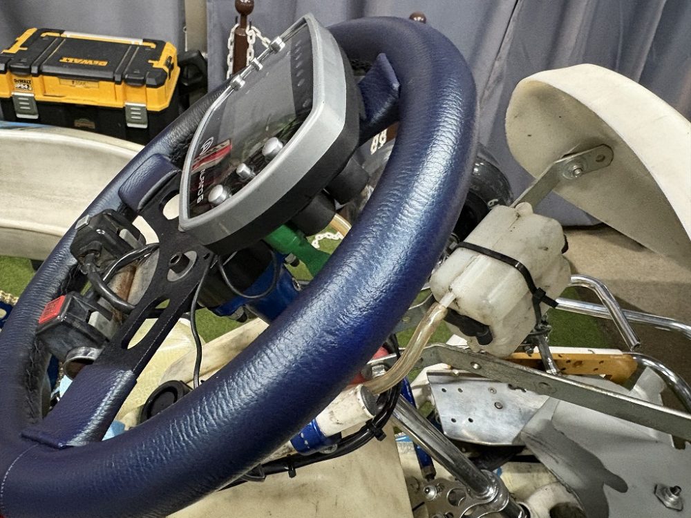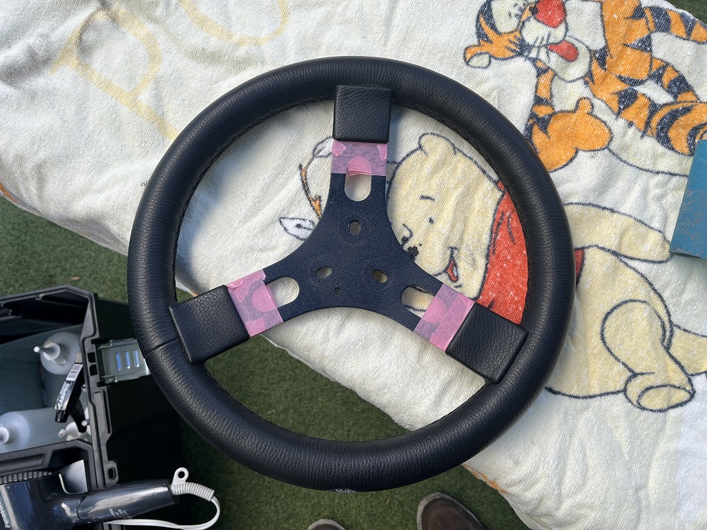 純正で黒の中古ステアリングをパールを含む青にカラーチェンジしています。